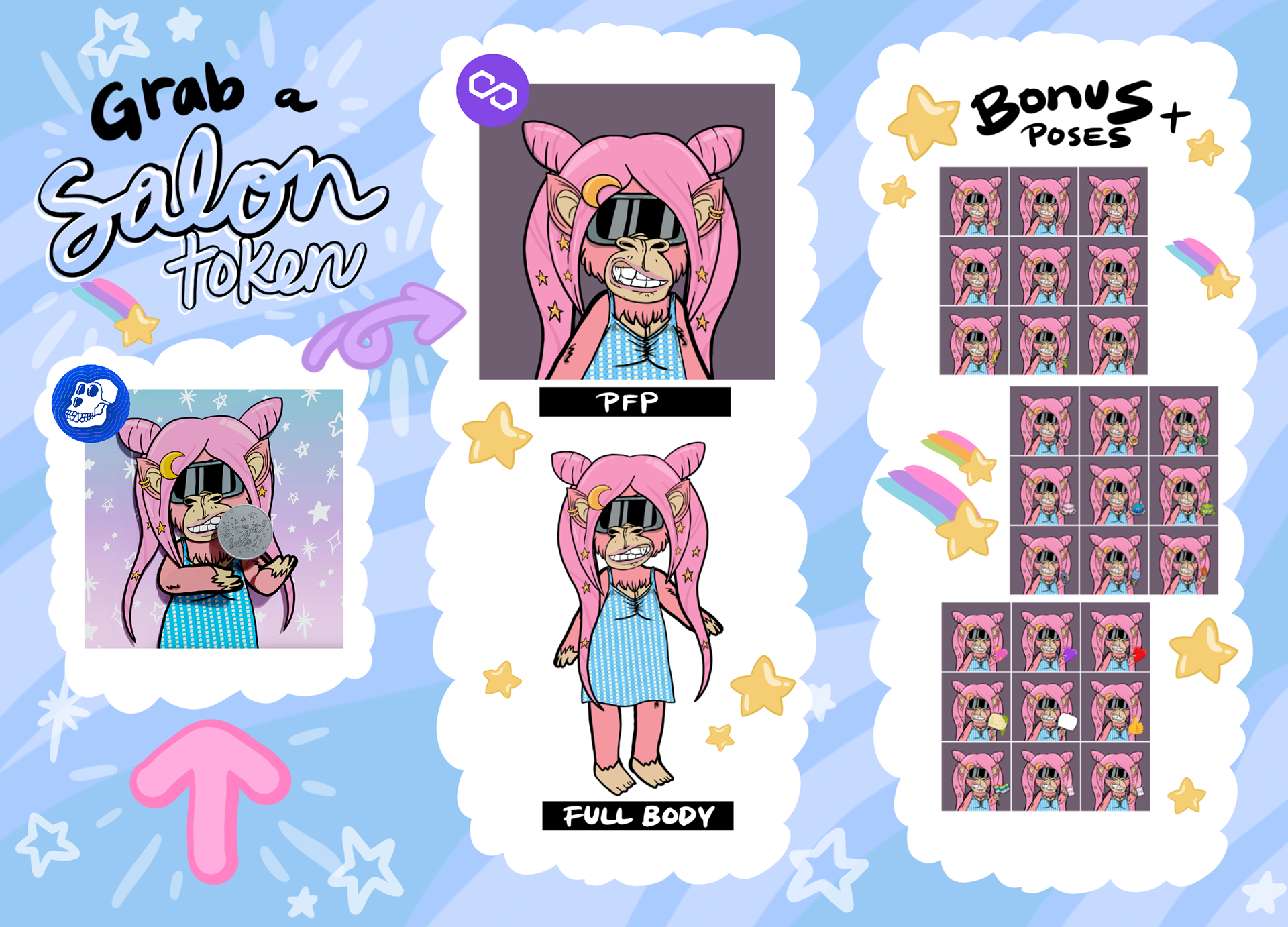 If you own a BAYC or MAYC, you can purchase a special Stargirl Salon NFT to begin transforming your IP into one of our unique Doll characters! You’ll receive both a PFP and full-body version of your character, along with multiple PFP poses that are perfect for sharing on social media.